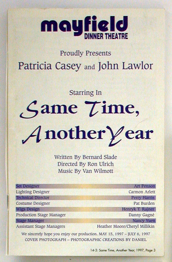 Notes:Cast: Patricia Casey and John Lawlor Operations Manager: Edward Symbaluk, Set Designer: Art Penson, Costume Designer: Pat Burden, Stage Manager: Nancy Yuen, Asst. Stage Managers: Heather Moore, Cheryl millikin, Lighting Designer: Carmon Arlett, Technical Director: Perry Harris, Props and Set Dressing: Phil Mayfield, Research Consultant: Lori Hammer, Master Carpenter: John Luumer, Head Of Theatre Carpentry: Carmon Arlett, Ticket Ofice Manager: Tracy Sikorski, Maitre'D: Trish Pino, Asst. Maitre 'D: Rhonda Griffiths, Director of Public Relations and Advertising: Pam Dussome, Director of Marketing: Bill Squarebriggs, Production Assistant: Jamie Elliot, Program Advertising: Stephen Kathnelson